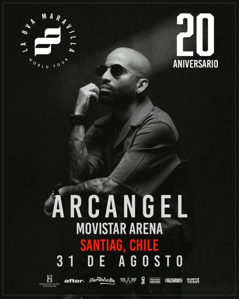 Lunes 2 de marzo de 2026.- El cantante estadounidense de origen latino Arcángel, acaba de anunciar una nueva visita a Chile en el marco de su nueva gira denominada “La 8va Maravilla”. En efecto, el cantante de música urbana se presentará en Chile el 31 de agosto en el Movistar Arena en lo que se espera sea un nuevo reencuentro del autor de los éxitos ‘Me prefieres a mí’, ‘Sigues con él’, ‘Hace mucho tiempo’ y ‘La Jumpa’, entre otros.