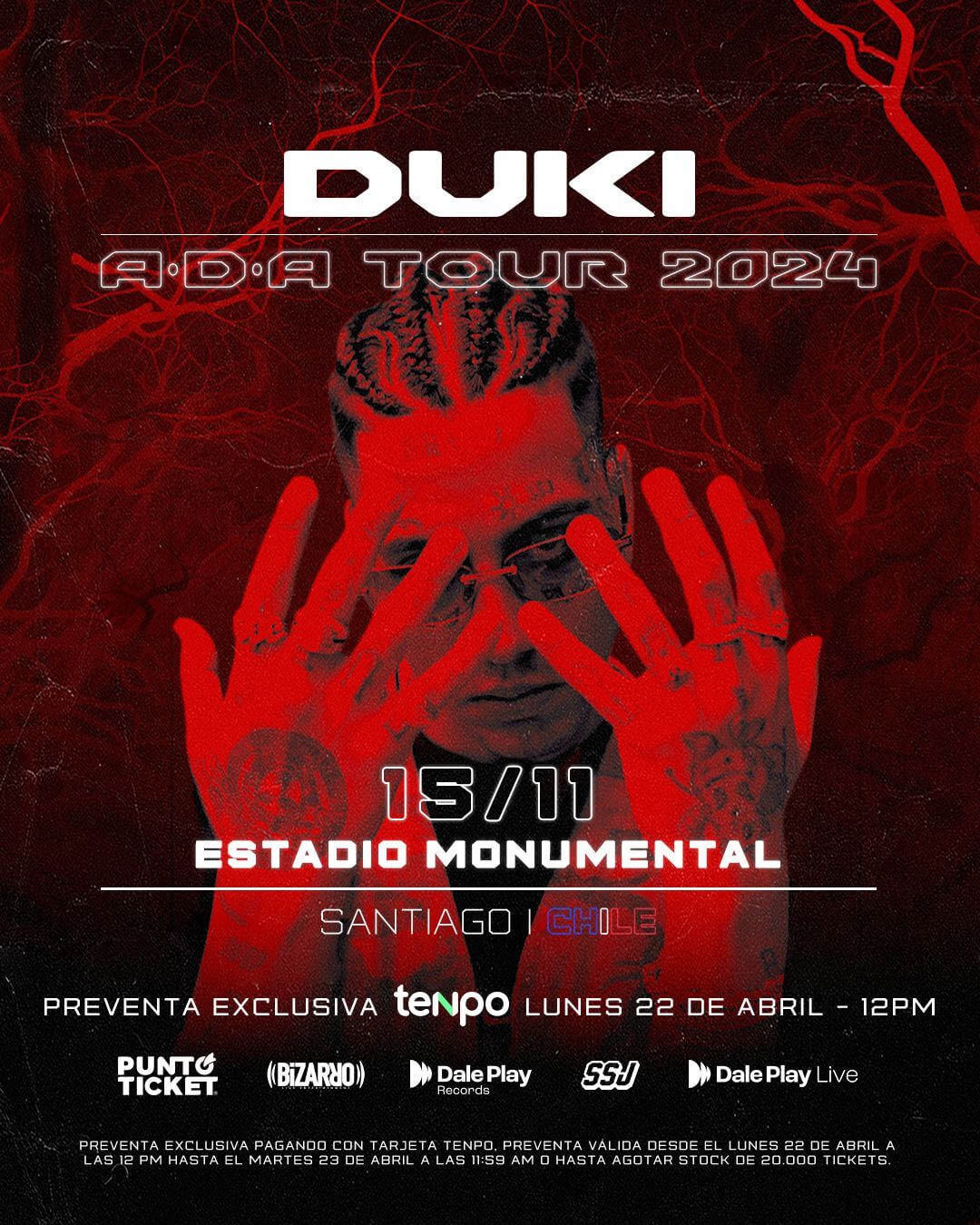 Este martes se inició la venta general para el concierto del cantante argentino Duki, una de las figuras argentinas con mayor trascendencia a nivel internacional y quien agotó recientemente dos Estadio Monumental de Rivel Plate en Buenos Aires y un Santiago Bernabeu en Madrid, además de un sold out en el Palacio de los Deportes en México, lo que confirma la increíble popularidad que mantiene a nivel mundial.
