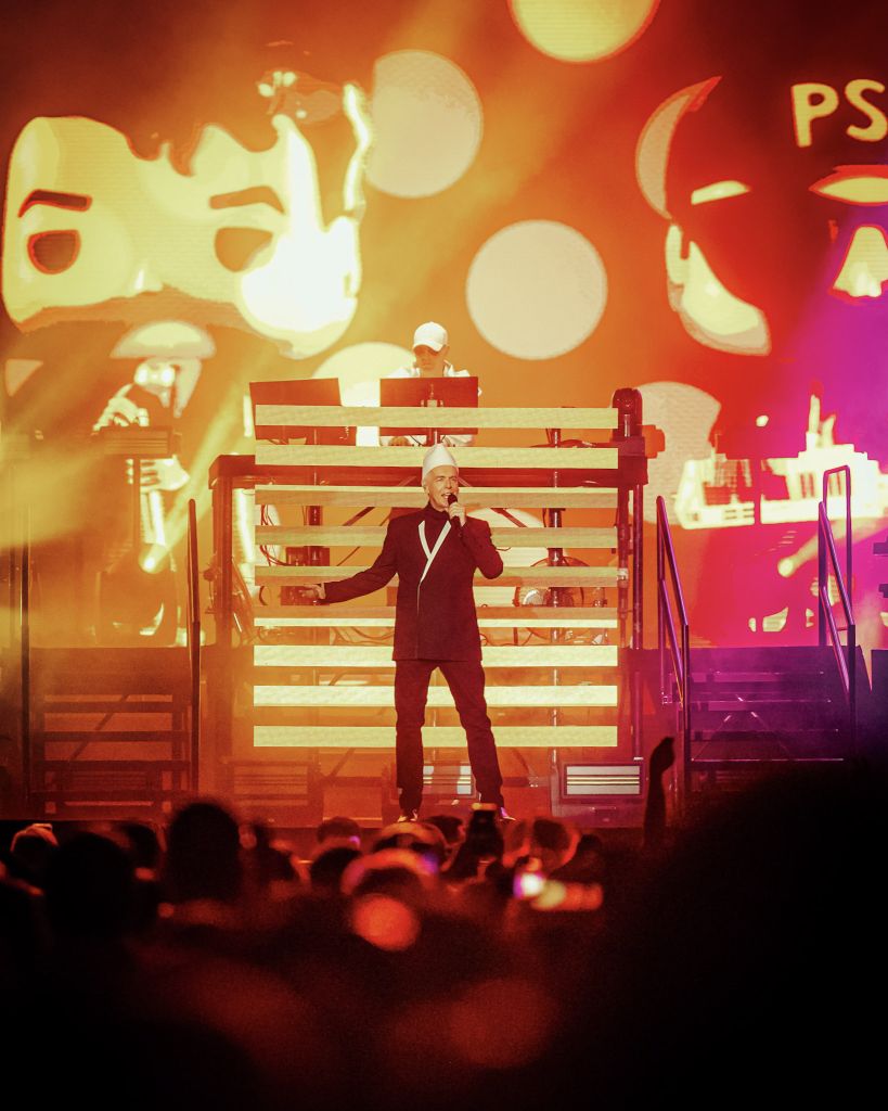 En efecto y cuando el reloj marcaba las 21 horas se produjo el ansiado blackout que indica que todo comenzará en segundos y así sucedió. Los gritos de los asistentes ovacionaron al dúo británico formado por Neil Tennant y Chris Lowe, que al ritmo de “Suburbia” daba comienzo a “Dreamworld Tour 2026” en Santiago. Lo que sucedería después, más que un concierto sería una verdadera experiencia ochentera.