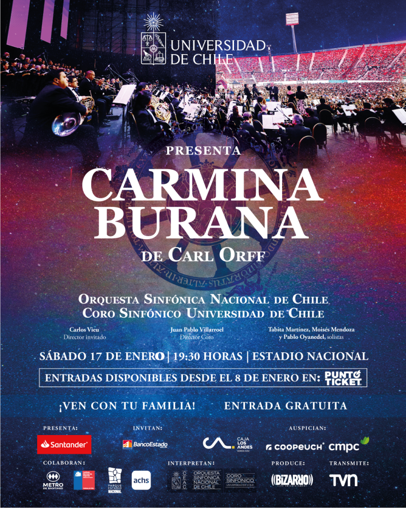 Carmina Burana, interpretado por la Orquesta Sinfónica Nacional de Chile y el Coro Sinfónico de la Universidad de Chile, en el Estadio Nacional”, señaló la Rectora de la Universidad de Chile, Rosa Devés.